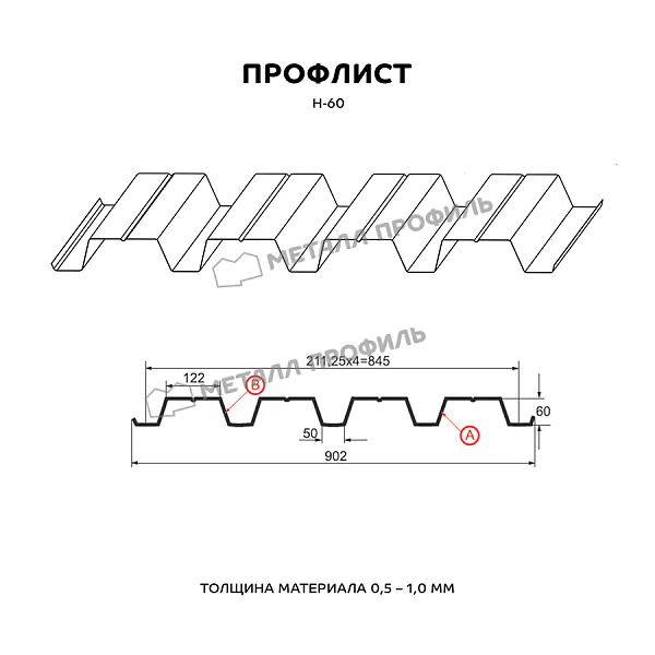 Профлист МЕТАЛЛ ПРОФИЛЬ Н-60x845-A (ПЭ-01-9006-0,7) широко применяется для монтажа профилированного листа. Изначально он представляет собой лист оцинкованной стали с покрытием. Толщина металла с оцинковкой и защитно-декоративным слоем составляет 0.7 мм. После проката на специальном оборудовании сталь приобретает рисунок из ритмичных волн. Такая форма придает профилю жёсткость.